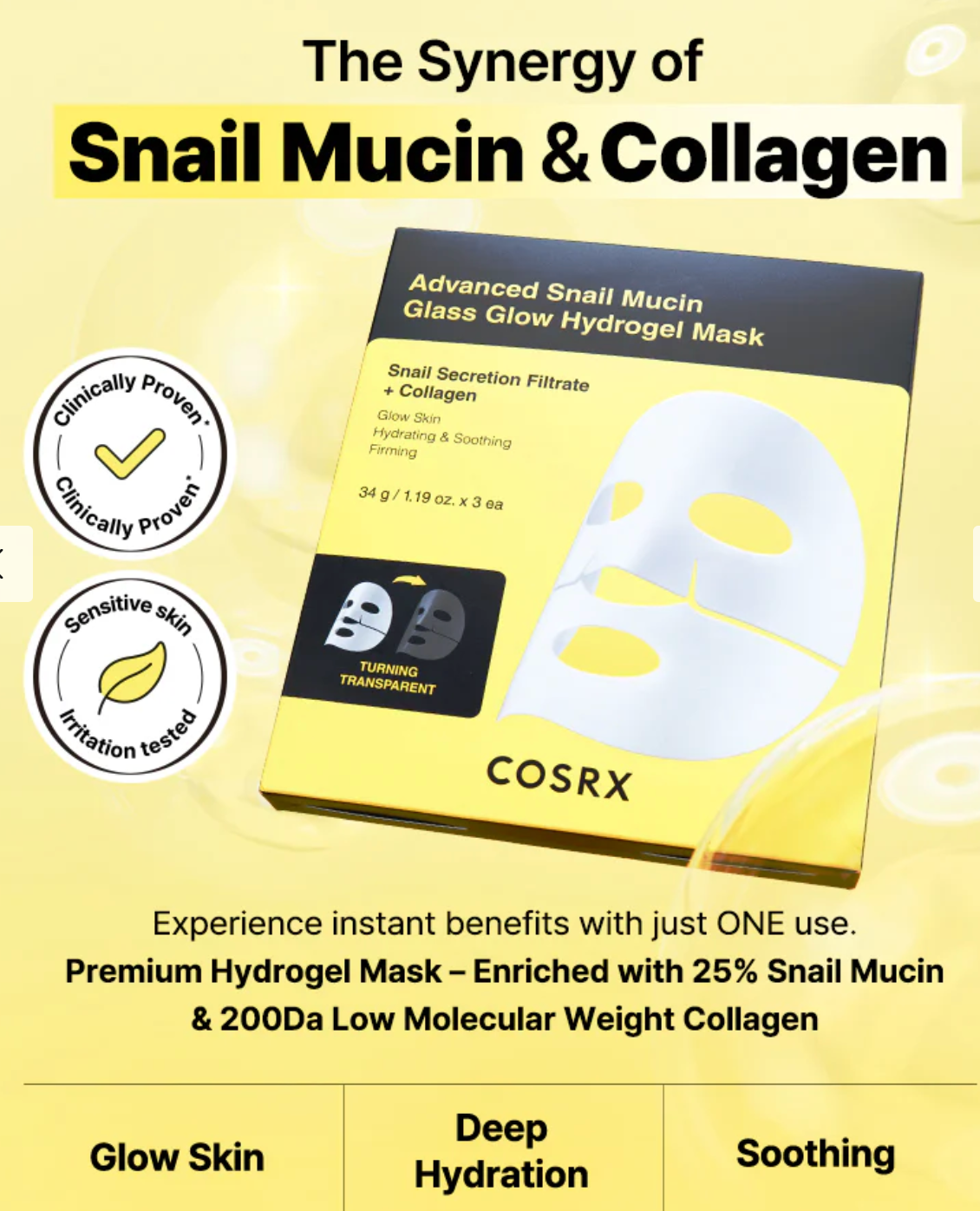Krijg een gladde huid na slechts één gebruik met het premium Snail & Collagen Hydrogel Mask!