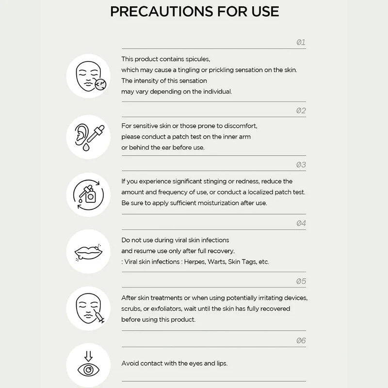 This product contains micro spicules that may cause a tingling feeling on skin. Please do not use during irritation or other skin infections.